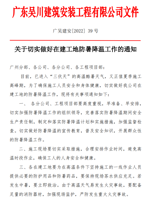關于切實做好在建工地防暑降溫工作的通知