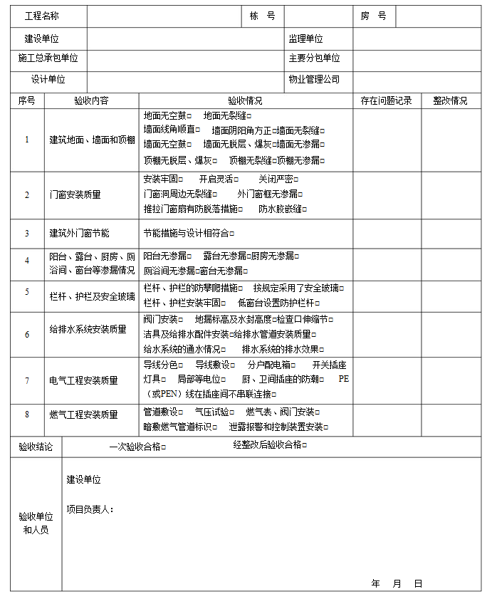 7、按照工程實(shí)際情況,分戶驗(yàn)收涉及的內(nèi)容,在表中方框內(nèi)填“√”, 否則留空。 |